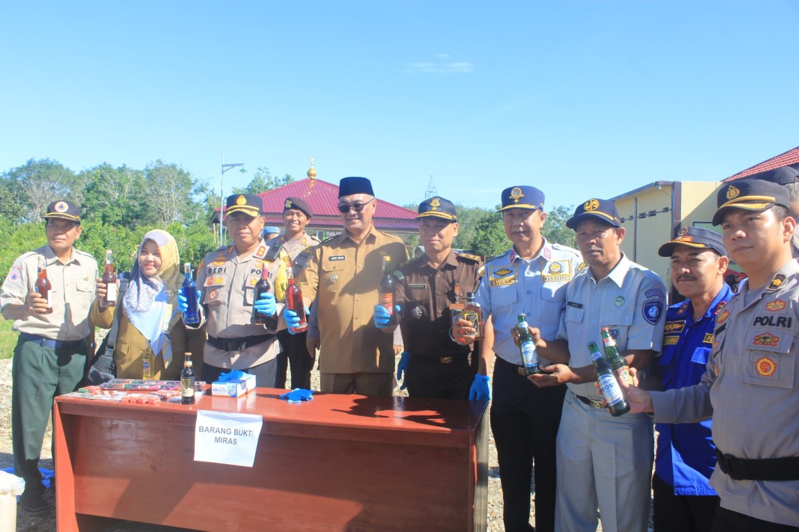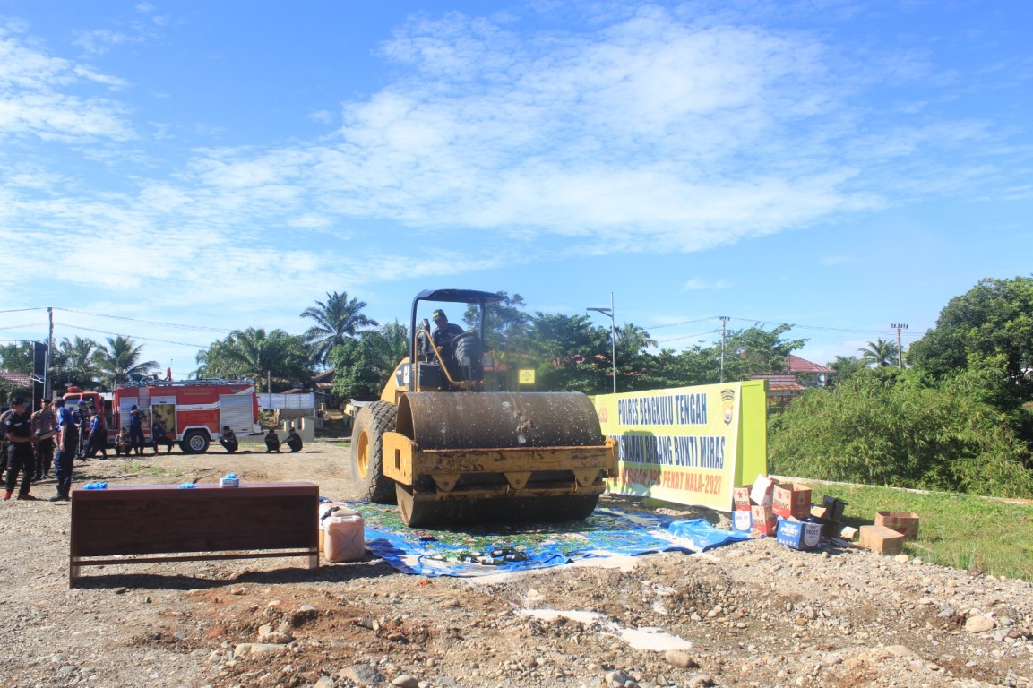 Setelah Apel Gelar Pasukan dilaksanakan , kegiatan dilanjutkan dengan pemusnahan barang bukti miras ops. Pekat 2023 . (psd)